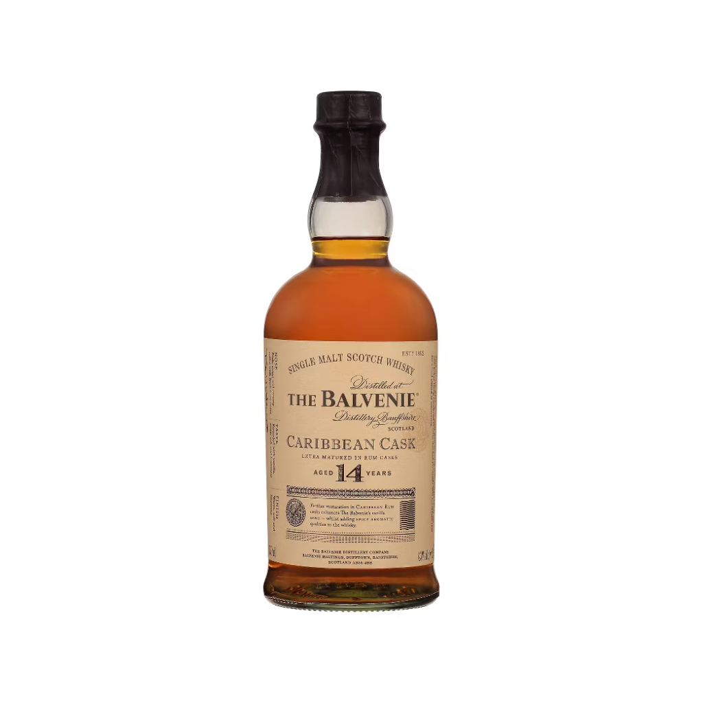 Balvenie 14 Caribbean Cask is a Speyside single malt Scotch whisky aged for 14 years in traditional whisky oak casks, then “finished” in casks that previously held a blend of West Indian rums. Bottled at 43% ABV, it offers a luscious, rounded profile with pronounced flavors of creamy toffee, vanilla, and sweet oak, complemented by underlying notes of tropical fruit and gentle spice. Exceptionally smooth and approachable, it’s ideal for sipping neat, with a splash of water, or over ice for a vibrant, fruit-accented Scotch experience.