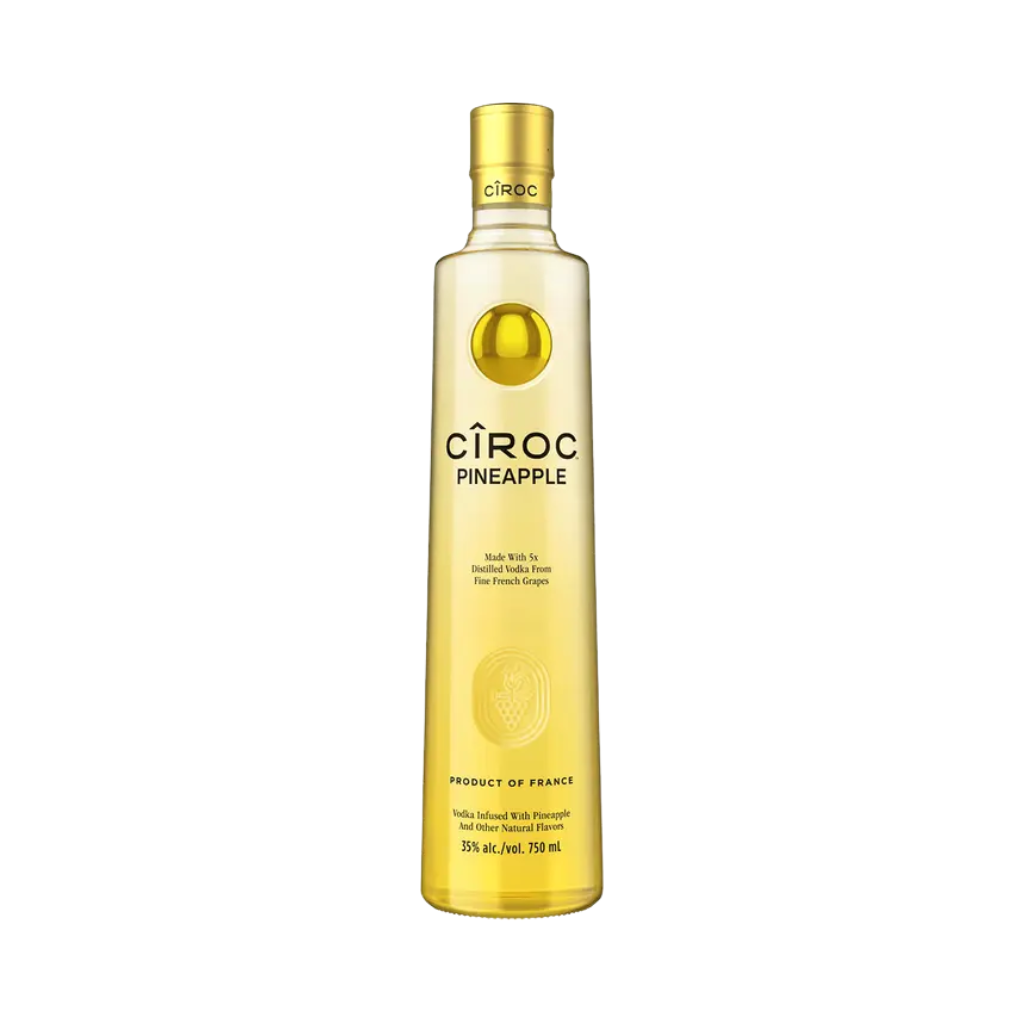 Cîroc Pineapple Vodka is a premium, ultra-smooth French vodka distilled five times from fine French grapes and bottled at 35% ABV. Expertly infused with juicy, succulent pineapple and natural tropical flavors, it offers bright aromas of freshly crushed pineapple, hints of vanilla, and a lush, creamy mouthfeel. Exceptionally versatile, it’s perfect for sipping chilled, over ice, or as an exotic twist in tropical cocktails with juices or lemon-lime soda.