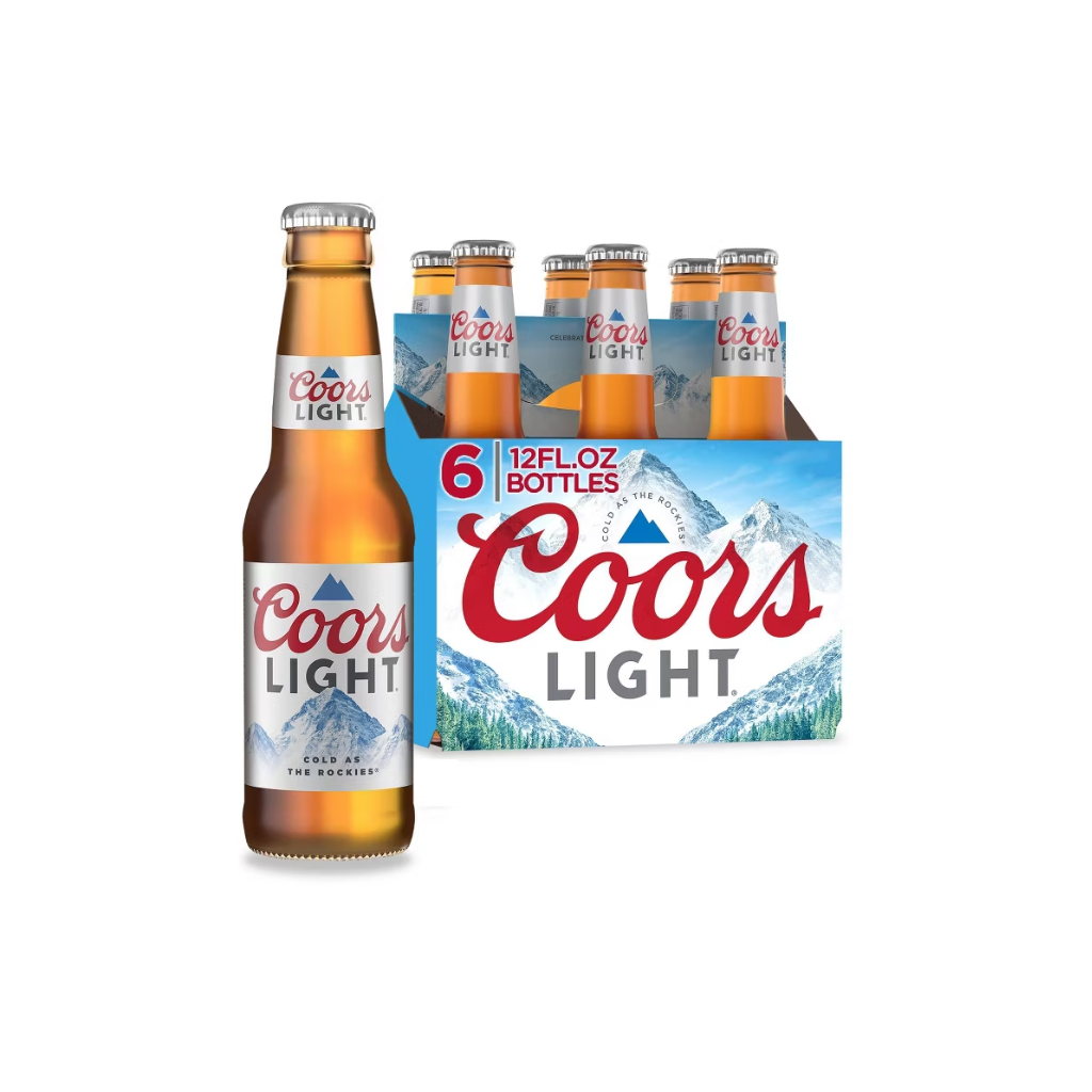 Six-pack of Coors Light bottles—crisp, light, and mountain-cool. Great for any occasion.