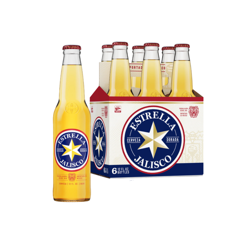 A 6-pack of Estrella Jalisco—crisp, light Mexican lager with a smooth finish and subtle bitterness. Perfect for sunny days and festive gatherings.