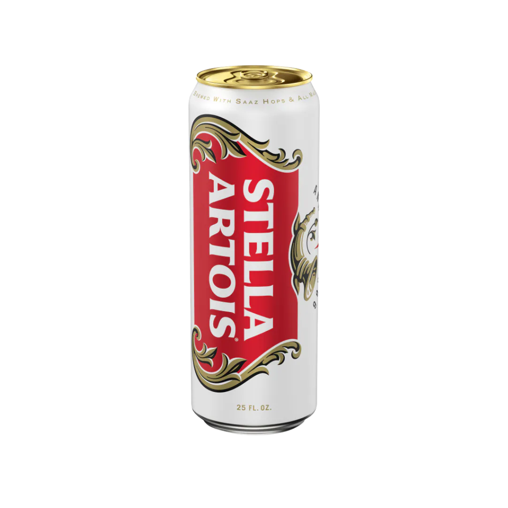 A single, tall can of Belgian Stella Artois lager—floral, smooth, and ready for every occasion.